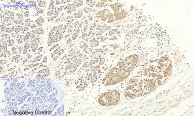 Immunohistochemistry analysis of paraffin-embedded Human stomach cancer using DRP1 antibody.High-pressure and temperature Sodium Citrate pH 6.0 was used for antigen retrieval. Negative control was used by secondary antibody only. |