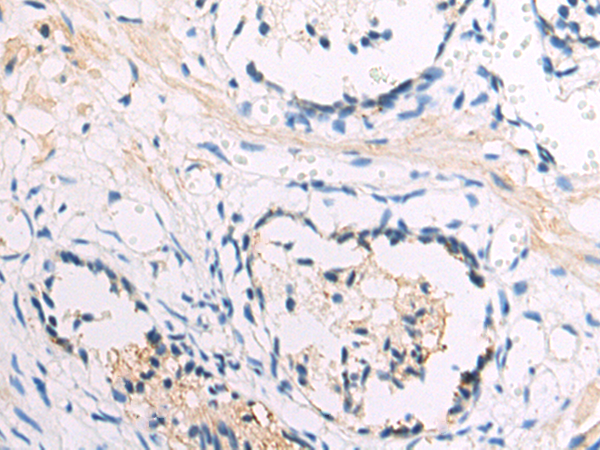 The image is immunohistochemistry of paraffin-embedded Human prostate cancer tissue using P12912(DSCC1 Antibody) at dilution 1/50. (Original magnification: ×200) |