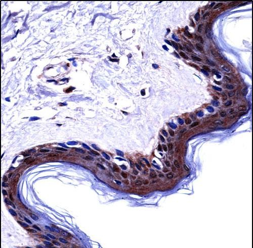 DSG1 Antibody (Center) (P31467)immunohistochemistry analysis in formalin fixed and paraffin embedded human skin tissue followed by peroxidase conjugation of the secondary antibody and DAB staining.This data demonstrates the use of DSG1 Antibody (Center) for immunohistochemistry. Clinical relevance has not been evaluated. |