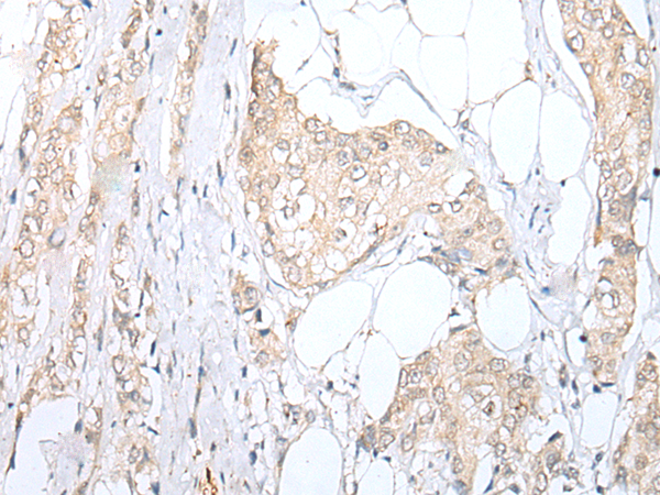 The image is immunohistochemistry of paraffin-embedded Human breast cancer tissue using P05760(DUSP16 Antibody) at dilution 1/20. (Original magnification: ×200) |