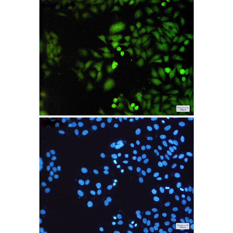 Immunocytochemistry analysis of DUSP3(green) in Hela using DUSP3 antibody,and DAPI(blue) |