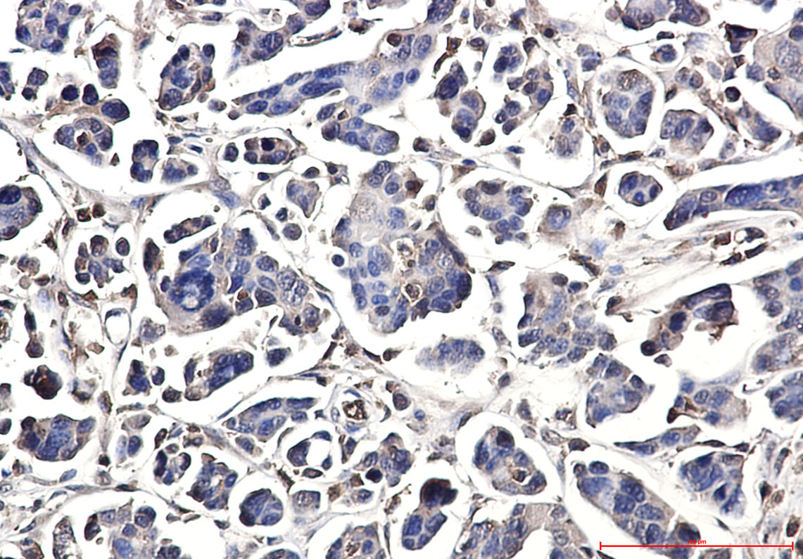 Immunohistochemistry analysis of paraffin-embedded Human Cholangiocarcinoma using DUSP3 antibody. High-pressure and temperature Sodium Citrate pH 6.0 was used for antigen retrieval. |