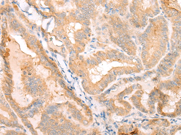 The image is immunohistochemistry of paraffin-embedded Human thyroid cancer tissue using P06406(DYNC1LI2 Antibody) at dilution 1/20. (Original magnification: ×200) |