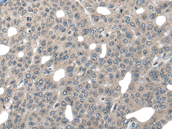 The image is immunohistochemistry of paraffin-embedded Human liver cancer tissue using P13162(DYRK1A Antibody) at dilution 1/30. (Original magnification: ×200) |