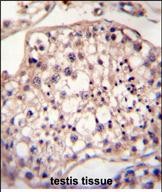 DYRK2 Antibody (N-term) (Cat. #P32616)immunohistochemistry analysis in formalin fixed and paraffin embedded human testis tissue followed by peroxidase conjugation of the secondary antibody and DAB staining.This data demonstrates the use of DYRK2 Antibody (N-term) for immunohistochemistry. Clinical relevance has not been evaluated. |