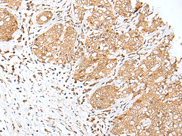 The image is immunohistochemistry of paraffin-embedded Human gastric cancer tissue using P12625(E2F8 Antibody) at dilution 1/35. (Original magnification: ×200) |