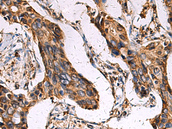 The image is immunohistochemistry of paraffin-embedded Human breast cancer tissue using P05647(ECM1 Antibody) at dilution 1/45. (Original magnification: ×200) |
