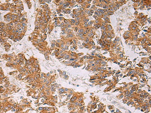 The image is immunohistochemistry of paraffin-embedded Human colorectal cancer tissue using P03891(EDNRB Antibody) at dilution 1/25. (Original magnification: ×200) |