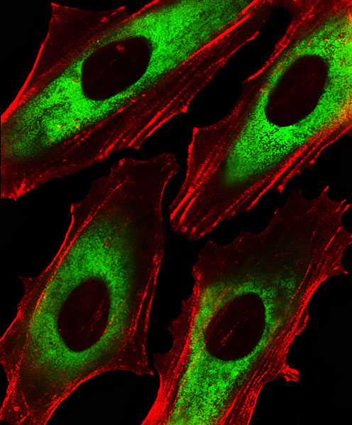 Fluorescent image of Hela cells stained with EEF1B2 Antibody (Center)(Cat#P32608). P32608 was diluted at 1:25 dilution. An Alexa Fluor 488-conjugated goat anti-rabbit lgG at 1:400 dilution was used as the secondary antibody (green). Cytoplasmic actin was counterstained with Alexa Fluor® 555 conjugated with Phalloidin (red). |