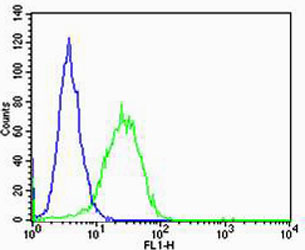 Flow cytometric analysis of Hela cells using EEF1B2 Antibody (Center)(green, Cat#P32608) compared to an isotype control of rabbit IgG(blue). P32608 was diluted at 1:25 dilution. An Alexa Fluor® 488 goat anti-rabbit lgG at 1:400 dilution was used as the secondary antibody. |