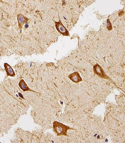 Immunohistochemical analysis of paraffin-embedded H. brain section using EEF1B2 Antibody (Center)(Cat#P32608). P32608 was diluted at 1:25 dilution. A peroxidase-conjugated goat anti-rabbit IgG at 1:400 dilution was used as the secondary antibody, followed by DAB staining. |
