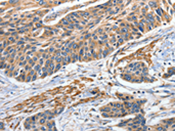 The image is immunohistochemistry of paraffin-embedded Human esophagus cancer tissue using P07277(EFNB2 Antibody) at dilution 1/80. (Original magnification: ×200) |