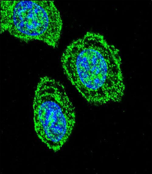 Confocal immunofluorescent analysis of EIF2S1 Antibody (N-term) (Cat#P31291) with Hela cell followed by Alexa Fluor 488-conjugated goat anti-rabbit lgG (green). DAPI was used to stain the cell nuclear (blue). |