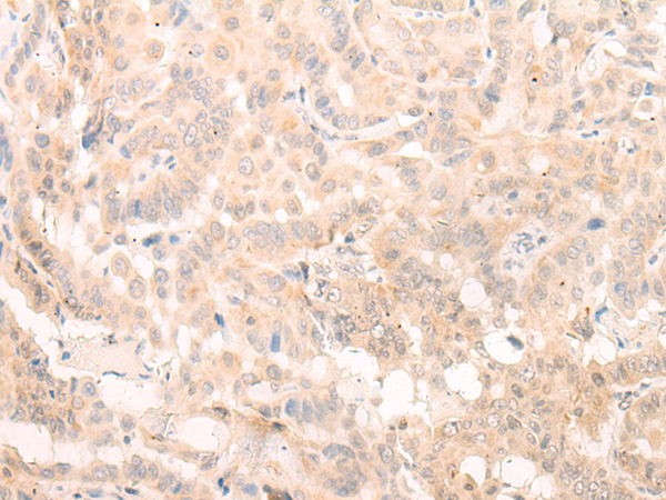 The image is immunohistochemistry of paraffin-embedded Human thyroid cancer tissue using P13305(EIF3B Antibody) at dilution 1/20. (Original magnification: ×200) |