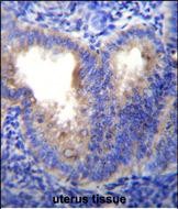 EIF5AL1 Antibody (C-term) (Cat. #P31025)immunohistochemistry analysis in formalin fixed and paraffin embedded human uterus tissue followed by peroxidase conjugation of the secondary antibody and DAB staining.This data demonstrates the use of EIF5AL1 Antibody (C-term) for immunohistochemistry. Clinical relevance has not been evaluated. |