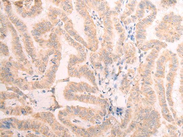 The image is immunohistochemistry of paraffin-embedded Human thyroid cancer tissue using P06428(EME2 Antibody) at dilution 1/25. (Original magnification: ×200) |