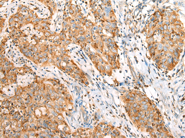 The image is immunohistochemistry of paraffin-embedded Human gastric cancer tissue using P12549(EML4 Antibody) at dilution 1/20. (Original magnification: ×200) |