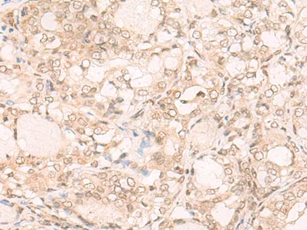 The image is immunohistochemistry of paraffin-embedded Human thyroid cancer tissue using P13323(ENO4 Antibody) at dilution 1/20. (Original magnification: ×200) |