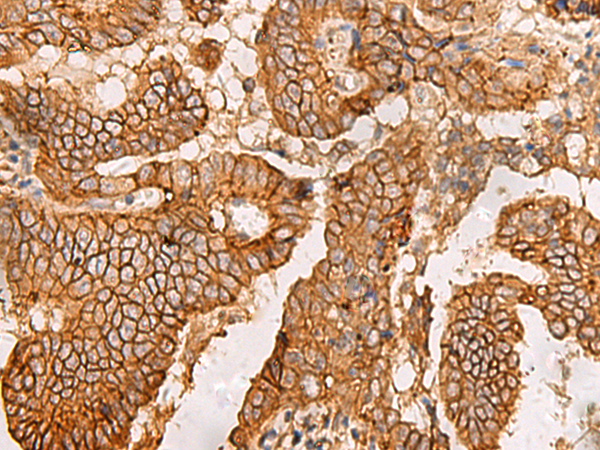 The image is immunohistochemistry of paraffin-embedded Human thyroid cancer tissue using P03910(EPCAM Antibody) at dilution 1/20. (Original magnification: ×200) |