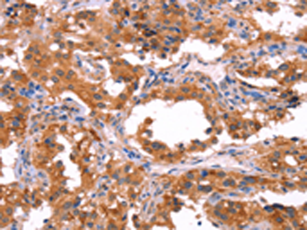 The image is immunohistochemistry of paraffin-embedded Human thyroid cancer tissue using P04853(ERAS Antibody) at dilution 1/40. (Original magnification: ×200) |