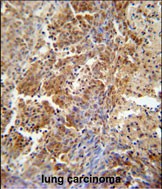 ERCC8 antibody (Center) (Cat. #P30880) immunohistochemistry analysis in formalin fixed and paraffin embedded human lung carcinoma followed by peroxidase conjugation of the secondary antibody and DAB staining. This data demonstrates the use of the ERCC8 antibody (Center) for immunohistochemistry. Clinical relevance has not been evaluated. |