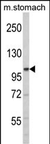 Western blot analysis of ERN2 N-term (Cat. #P32746) in mouse stomach tissue lysates (35ug/lane). ERN2 (arrow) was detected using the purified Pab. |