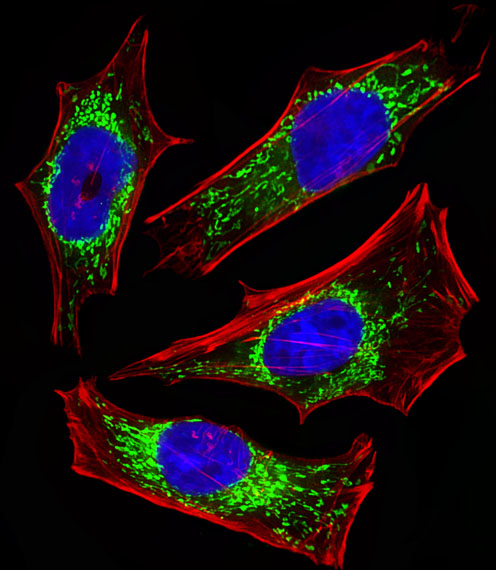 Fluorescent image of Hela cells stained with ETFA Antibody (Center)(Cat#P32649). P32649 was diluted at 1:25 dilution. An Alexa Fluor 488-conjugated goat anti-rabbit lgG at 1:400 dilution was used as the secondary antibody (green). DAPI was used to stain the cell nuclear (blue). Cytoplasmic actin was counterstained with Alexa Fluor® 555 conjugated with Phalloidin (red). |