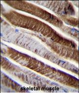 ETFA Antibody (C-term) (Cat. #P30922)immunohistochemistry analysis in formalin fixed and paraffin embedded human skeletal muscle followed by peroxidase conjugation of the secondary antibody and DAB staining.This data demonstrates the use of ETFA Antibody (C-term) for immunohistochemistry. Clinical relevance has not been evaluated. |
