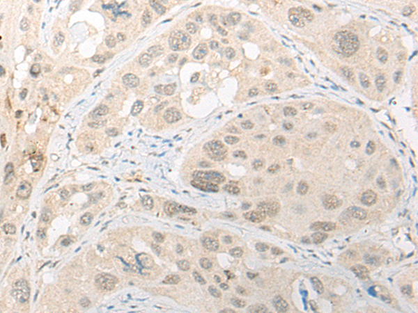 The image is immunohistochemistry of paraffin-embedded Human esophagus cancer tissue using P13204(ETS1 Antibody) at dilution 1/25. (Original magnification: ×200) |