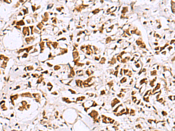 The image is immunohistochemistry of paraffin-embedded Human breast cancer tissue using P03113(EWSR1 Antibody) at dilution 1/60. (Original magnification: ×200) |