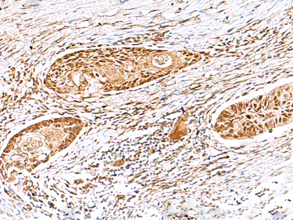 The image is immunohistochemistry of paraffin-embedded Human esophagus cancer tissue using P03113(EWSR1 Antibody) at dilution 1/60. (Original magnification: ×200) |