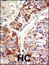 Formalin-fixed and paraffin-embedded human cancer tissue reacted with the primary antibody, which was peroxidase-conjugated to the secondary antibody, followed by DAB staining. This data demonstrates the use of this antibody for immunohistochemistry; clinical relevance has not been evaluated. BC = breast carcinoma; HC = hepatocarcinoma. |
