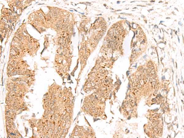 The image is immunohistochemistry of paraffin-embedded Human colorectal cancer tissue using P13387(FAM50A Antibody) at dilution 1/20. (Original magnification: ×200) |