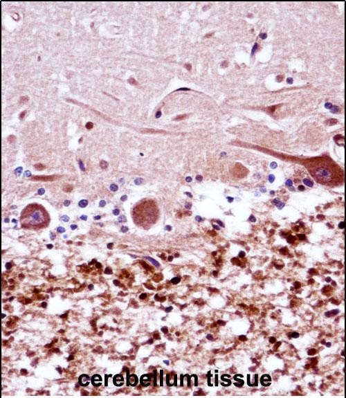 FANCG Antibody (C-term) (P31511)immunohistochemistry analysis in formalin fixed and paraffin embedded human cerebellum tissue followed by peroxidase conjugation of the secondary antibody and DAB staining.This data demonstrates the use of FANCG Antibody (C-term) for immunohistochemistry. Clinical relevance has not been evaluated. |