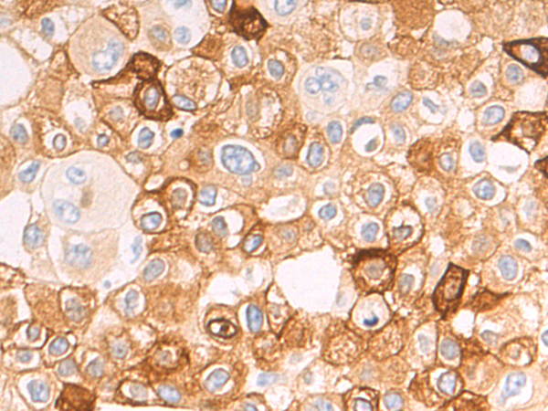 The image is immunohistochemistry of paraffin-embedded Human breast cancer tissue using P12493(FASN Antibody) at dilution 1/50. (Original magnification: ×200) |