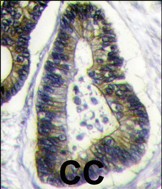 Formalin-fixed and paraffin-embedded human colon carcinoma reacted with FUBI Antibody (N-term)(Cat.#P30189), which was peroxidase-conjugated to the secondary antibody, followed by DAB staining. This data demonstrates the use of this antibody for immunohistochemistry; clinical relevance has not been evaluated. |