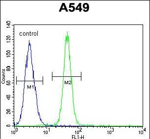 FBXO24 Antibody (Center) (Cat. #P30891) flow cytometric analysis of A549 cells (right histogram) compared to a negative control cell (left histogram).FITC-conjugated goat-anti-rabbit secondary antibodies were used for the analysis. |