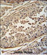 FBXO24 antibody (Center) (Cat. #P30891) immunohistochemistry analysis in formalin fixed and paraffin embedded human testis tissue followed by peroxidase conjugation of the secondary antibody and DAB staining. This data demonstrates the use of the FBXO24 antibody (Center) for immunohistochemistry. Clinical relevance has not been evaluated. |