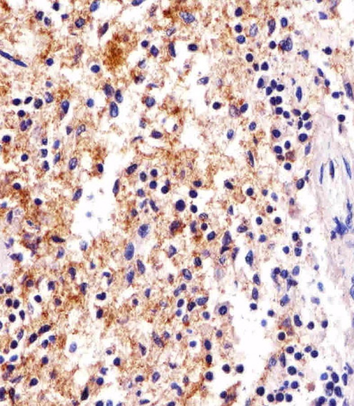 Immunohistochemical analysis of paraffin-embedded H. spleen section using FCER1G Antibody (C-term)(Cat#P32318). P32318 was diluted at 1:25 dilution. A undiluted biotinylated goat polyvalent antibody was used as the secondary, followed by DAB staining. |