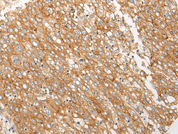 The image is immunohistochemistry of paraffin-embedded Human esophagus cancer tissue using P03785(FGF3 Antibody) at dilution 1/30. (Original magnification: ×200) |