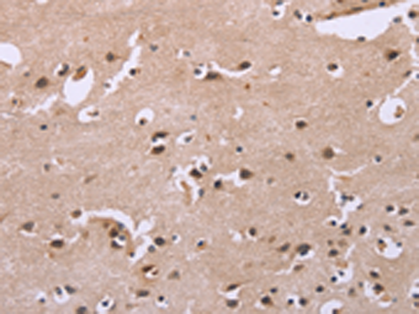The image is immunohistochemistry of paraffin-embedded Human brain tissue using P03914(FGFR2 Antibody) at dilution 1/20. (Original magnification: ×200) |