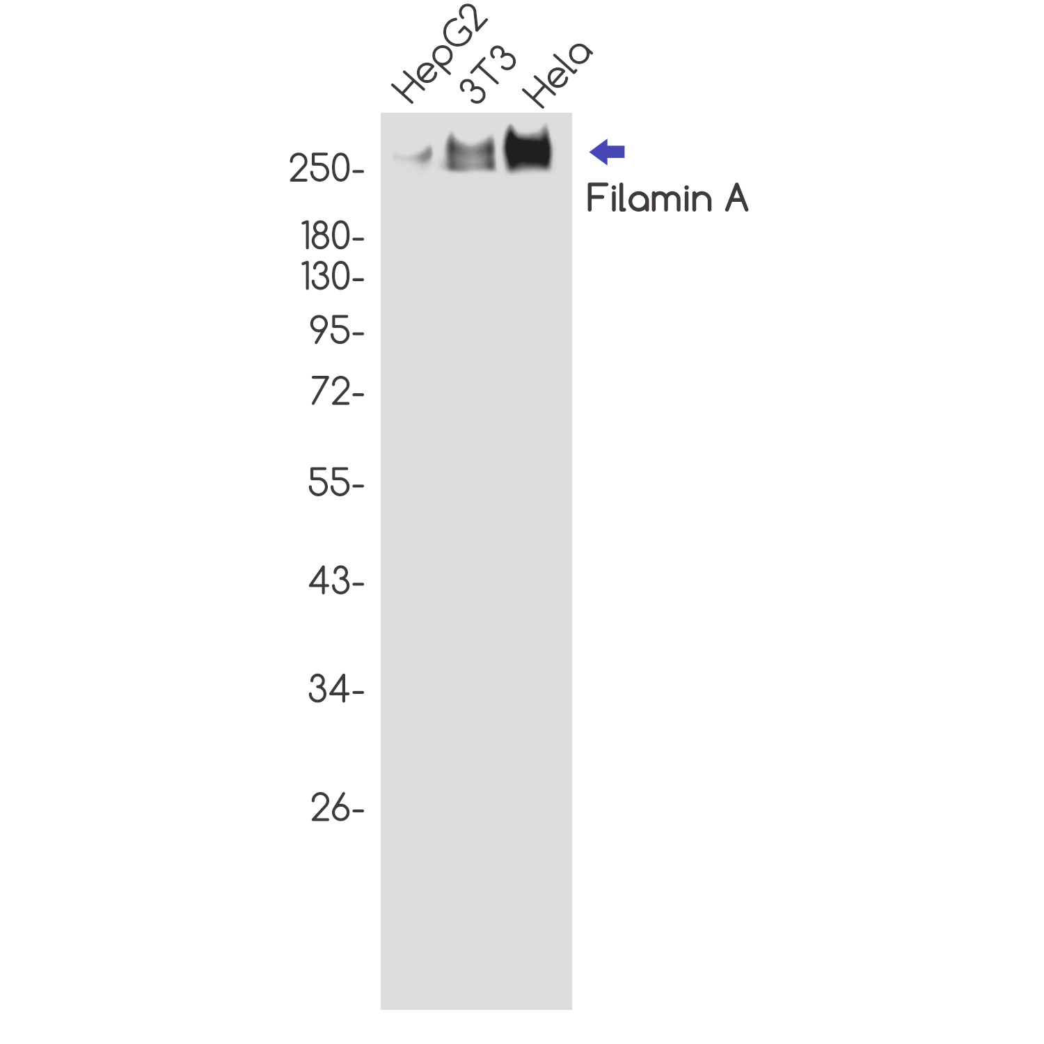 Western blot analysis of Filamin A in HepG2, 3T3, Hela lysates using Filamin A antibody. |