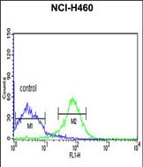 FKBP14 Antibody (N-term) (Cat. #P30380) flow cytometric analysis of NCI-H460 cells (right histogram) compared to a negative control cell (left histogram).FITC-conjugated goat-anti-rabbit secondary antibodies were used for the analysis. |