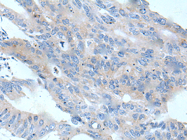 The image is immunohistochemistry of paraffin-embedded Human colorectal cancer tissue using P12896(FLT4 Antibody) at dilution 1/35. (Original magnification: ×200) |