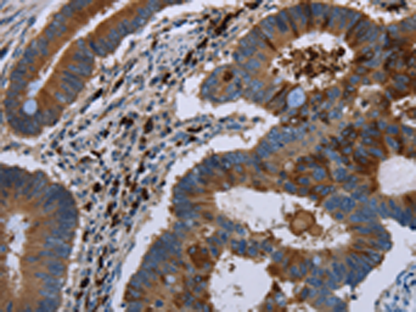The image is immunohistochemistry of paraffin-embedded Human colon cancer tissue using P11769(FMN2 Antibody) at dilution 1/20. (Original magnification: ×200) |