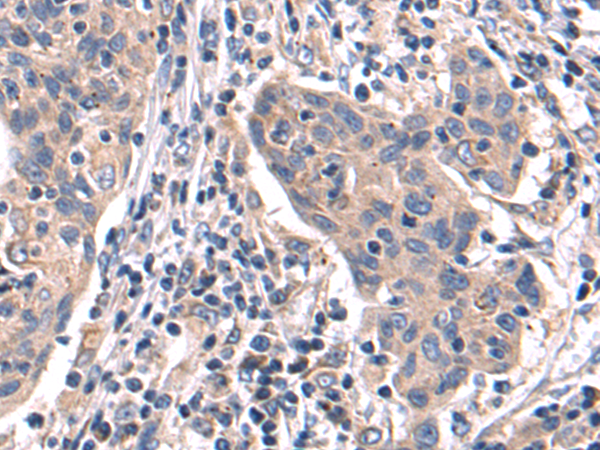 The image is immunohistochemistry of paraffin-embedded Human cervical cancer tissue using P13823(FOLR1 Antibody) at dilution 1/50. (Original magnification: ×200) |