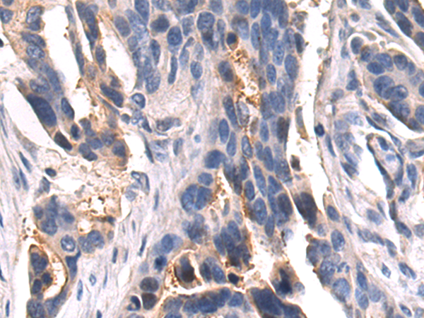 The image is immunohistochemistry of paraffin-embedded Human colorectal cancer tissue using P13823(FOLR1 Antibody) at dilution 1/50. (Original magnification: ×200) |