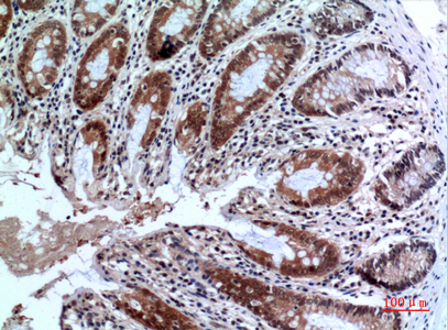 Immunohistochemistry analysis of paraffin-embedded Human colon using FOXP3 antibody.High-pressure and temperature Sodium Citrate pH 6.0 was used for antigen retrieval. |