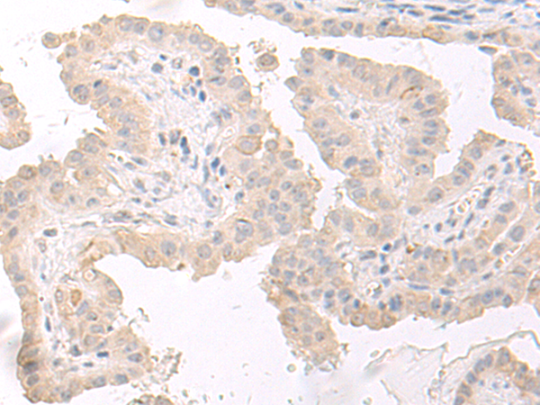The image is immunohistochemistry of paraffin-embedded Human thyroid cancer tissue using P02786(FOXRED2 Antibody) at dilution 1/45. (Original magnification: ×200) |