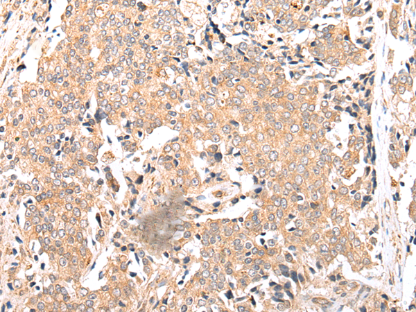 The image is immunohistochemistry of paraffin-embedded Human gastric cancer tissue using P05656(FPR1 Antibody) at dilution 1/20. (Original magnification: ×200) |